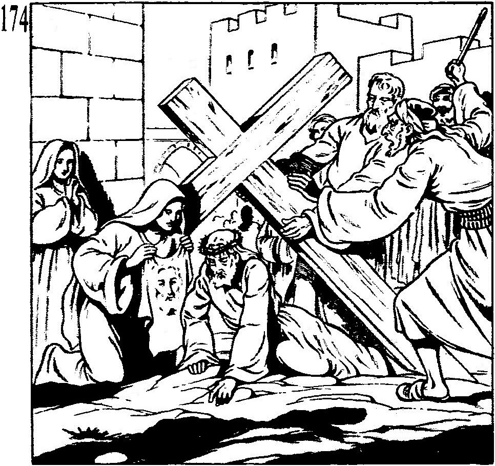 Jézusnak a keresztet vinni. Mint mondják, ekkor egy asszony közeledett Jézushoz a tömegből, - Veronikának hívták és kendőjét nyújtotta feléje, hogy abban véres-sáros arcát megtörölhesse. Hálából Jézus szent Arcának képmását nyomta rá a kendőre és úgy adta vissza azt.